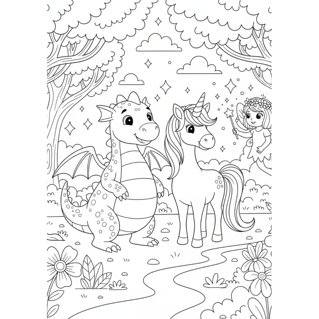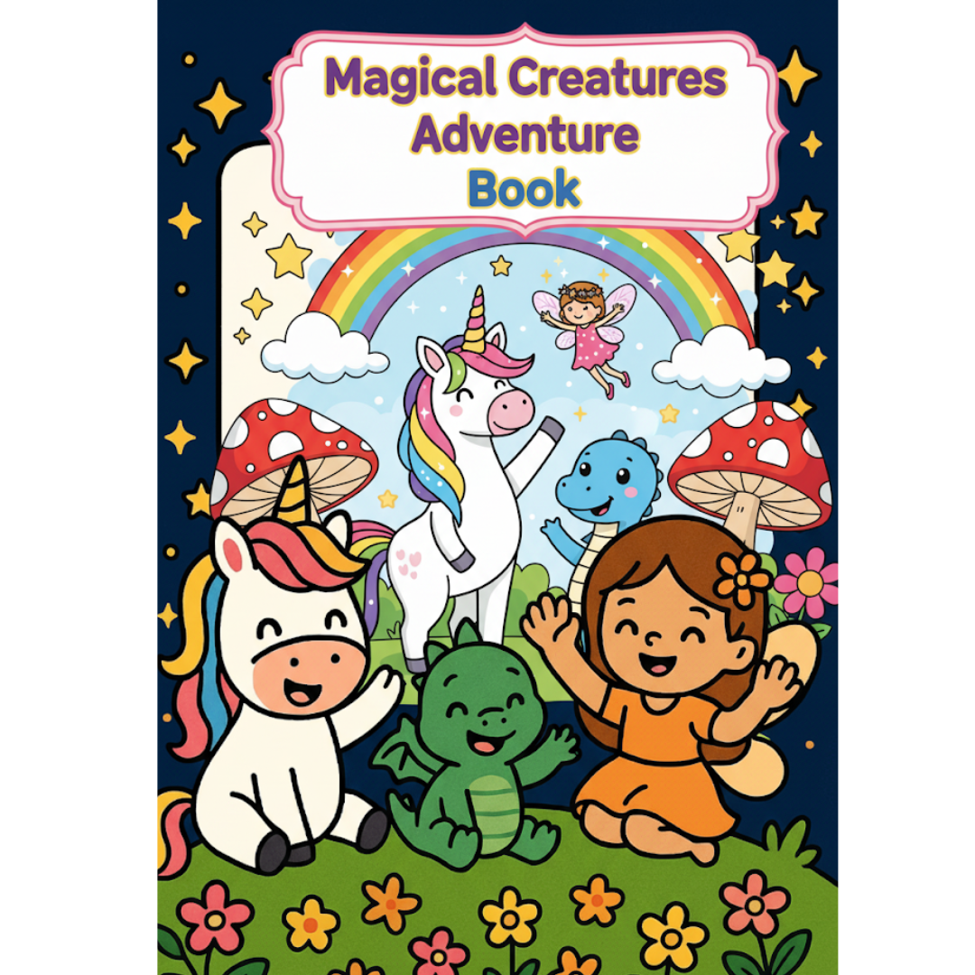 Step into an enchanted world filled with wonder and imagination with Magical Creatures Adventure! This beautifully designed coloring eBook invites children to explore a magical land of unicorns, dragons, fairies, mermaids, and other mythical friends while enjoying calming, screen-free creativity.